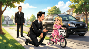 He turned. A little girl stood there holding a rusted pink bicycle, shivering under the rain. Her shoes were torn, her face pale, and her eyes looked far too tired for someone her age.