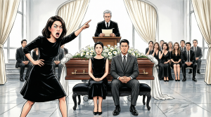 At the front, his casket sat beneath a spray of white roses and blue delphiniums. Father Martinez was speaking softly to Mr. Blackwood, Dad’s attorney and oldest friend. My aunt Helen was directing people with the expression of a woman who would personally fistfight chaos if it tried her. All of it felt unreal, like I’d wandered into a performance of my own life and someone else had been cast as me.