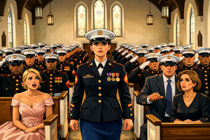 The old wooden hallway outside Quantico’s chapel stretched long beneath soft amber lights, polished so clean it reflected the shine of every brass button on my dress blues. For one strange heartbeat, no one moved—not Master Sergeant Diaz beside the door, not Sergeant Rocco near the entrance, not even the nervous aide adjusting flowers at the end of the hall.