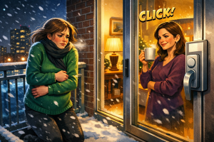 I pounded on the glass again, weaker this time. Inside, the apartment looked warm and bright, full of movement, completely disconnected from what was happening just a few feet away. I saw Ryan’s mother carrying dishes. I heard laughter through the glass. At one point, I saw Melissa walk past the door without even glancing at me.