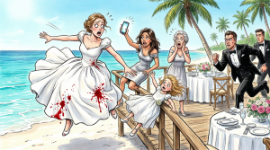 The shove sent Mia flying backward over the wooden railing, crashing onto the decorative rocks below. Her scream tore through my soul. I lunged to the edge, seeing Mia lying motionless, bright red blood beginning to seep onto the white sand.