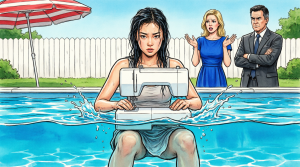 Lily dropped to her knees beside the pool, reaching helplessly toward the water as her sewing machine disappeared beneath the surface. It had taken her six months to save for it—babysitting, selling handmade tote bags online, cutting every corner she could. That machine was her dream, her escape.